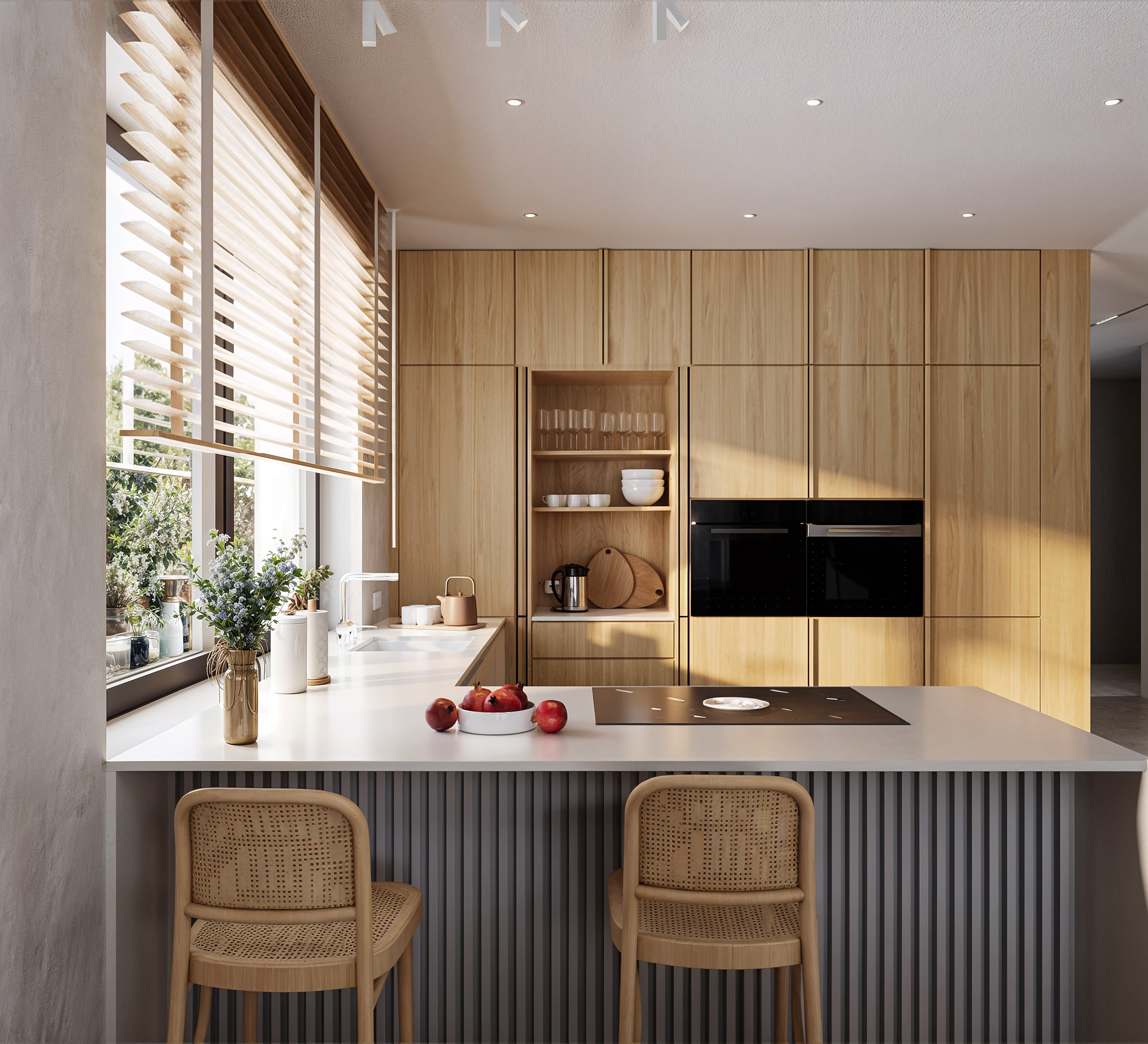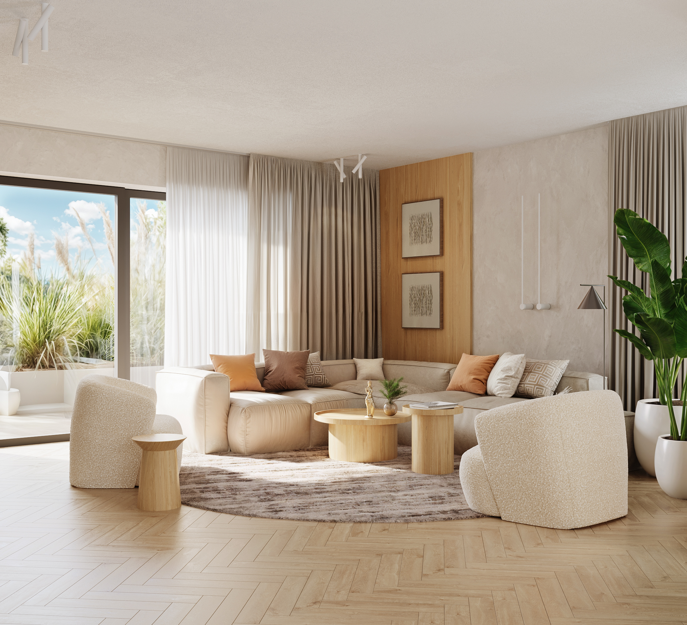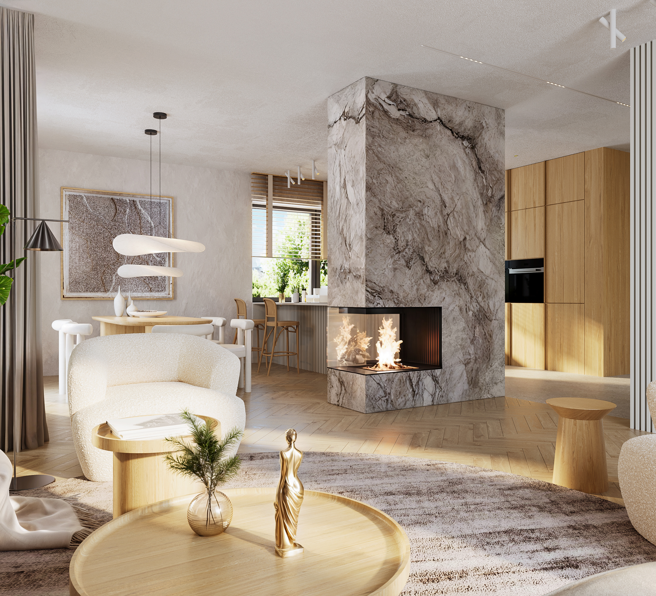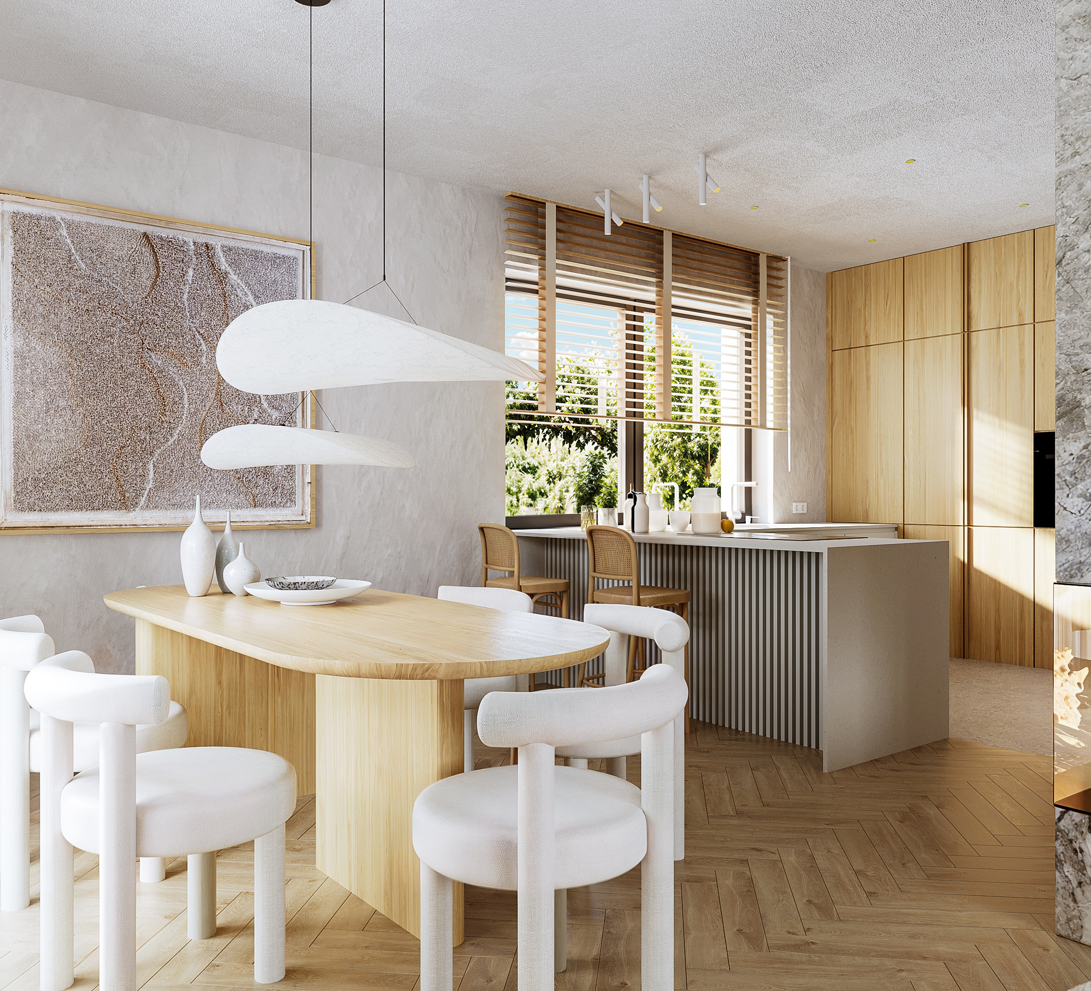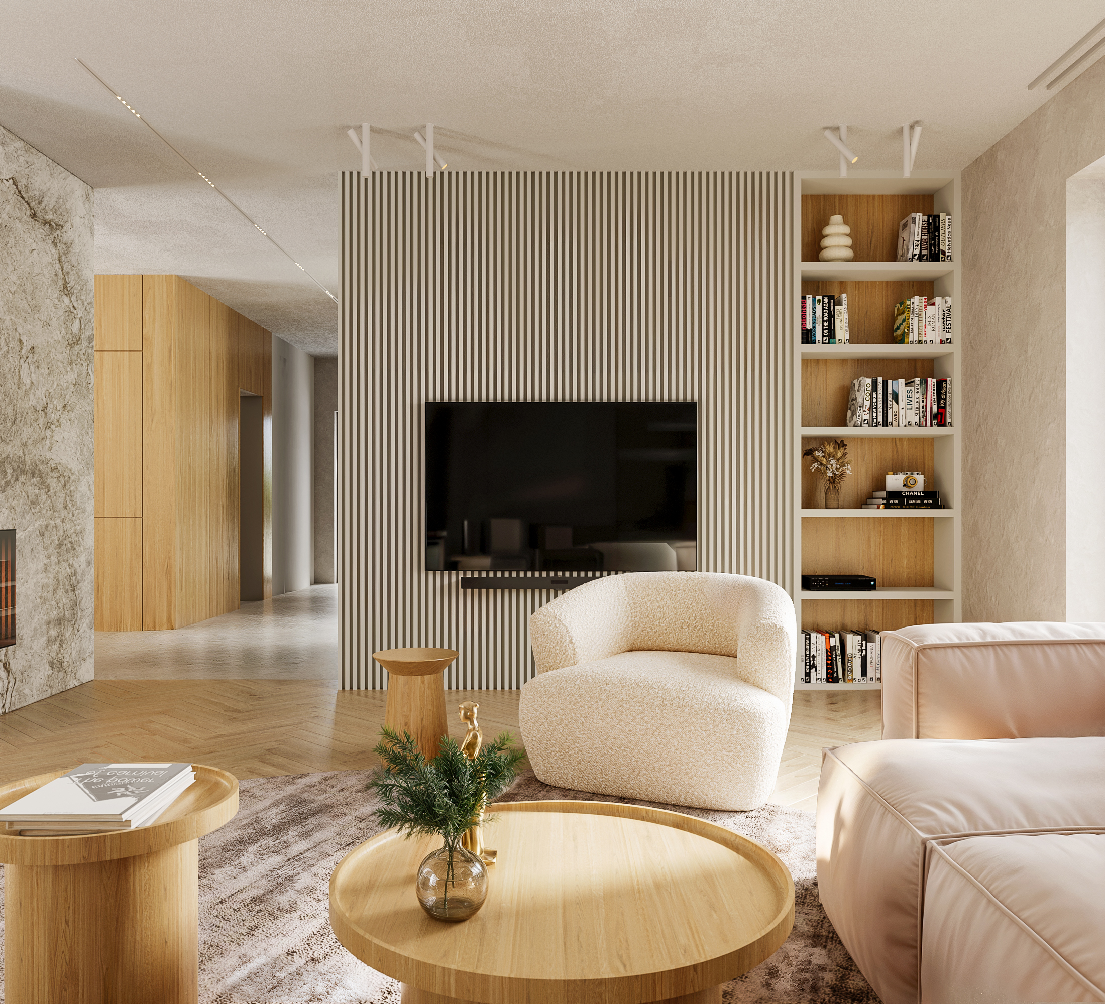 Kluczowym założeniem projektu była trwałość zastosowanych materiałów oraz ponadczasowa estetyka, dzięki czemu wnętrze pozostanie eleganckie i aktualne przez długie lata. Dominują naturalne barwy, drewno i miękkie tkaniny, które wprowadzają przytulny klimat i harmonię w całym domu.